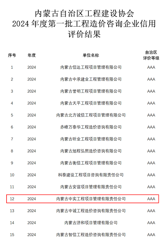 2024-07-3015347 次近期,我公司参加内蒙古自治区工程建设协会组织的“2024年度第一批工程造价咨询企业信用”申报,获得“信用AAA级证书”。我公司成立多年以来,遵循中国工程造价管理协会对造价咨询企…